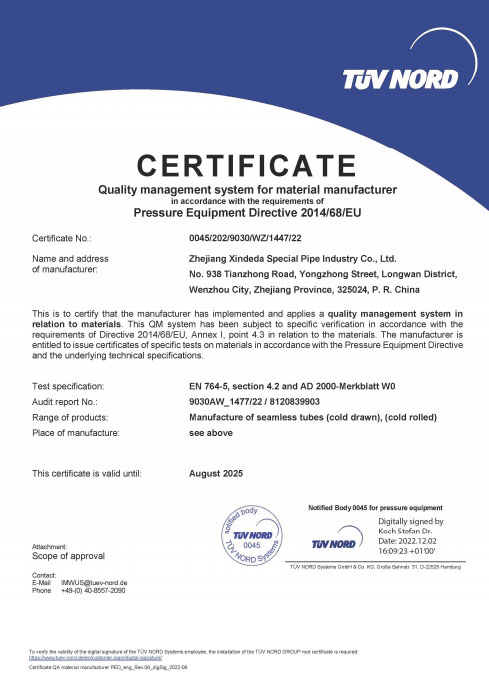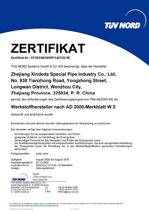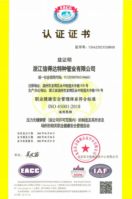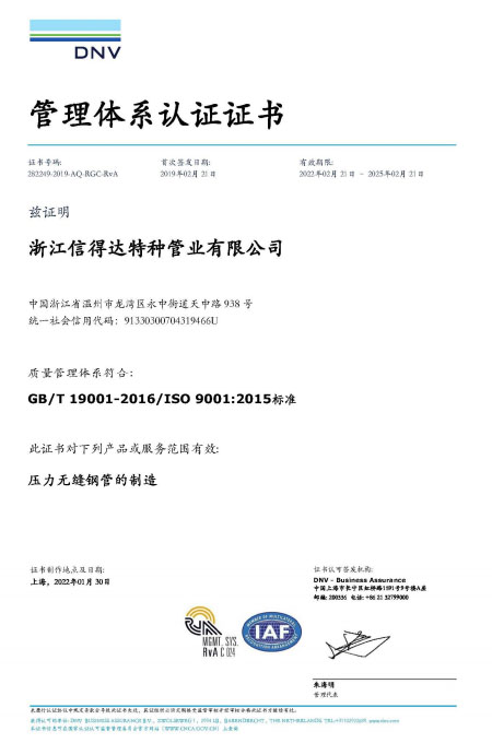 公司已全面通過了ISO9001:2008質(zhì)量管理體系認(rèn)證、14000環(huán)境管理體系認(rèn)證、18000職業(yè)健康管理體系認(rèn)證、國(guó)家質(zhì)量檢驗(yàn)檢疫總局A2-B類壓力管道元件制造許可、 歐盟PED認(rèn)證及德國(guó)AD-2000產(chǎn)品強(qiáng)制認(rèn)證、美國(guó)ASME材料產(chǎn)品認(rèn)證、信得達(dá)擁有1條穿孔生產(chǎn)線,10條冷拔生產(chǎn)線8條冷軋?zhí)胤N無縫鋼管生產(chǎn)線。